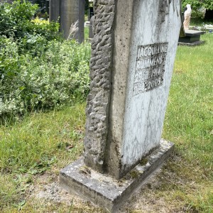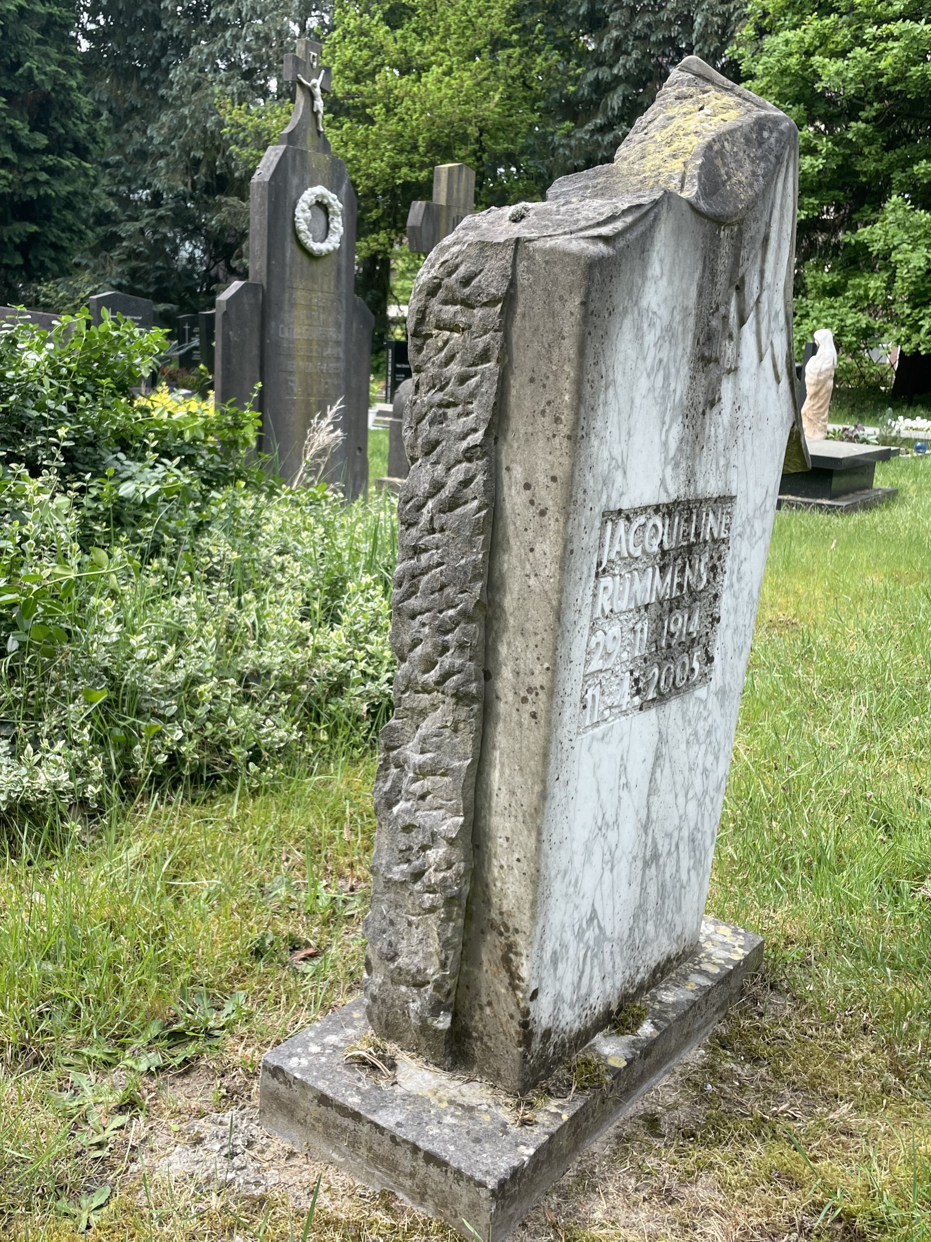 Jacqueline Rummens was goed bevriend met de beeldhouwer Jo Gijsen. Hij heeft deze prachtige marmeren grafsteen voor haar gemaakt. Waarschijnlijk kenden ze elkaar via haar vader Auguste, die ook beeldhouwer was.