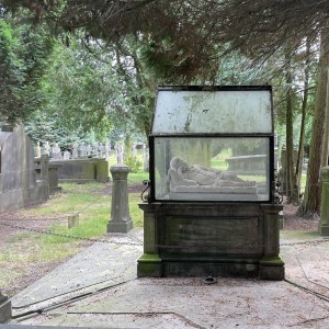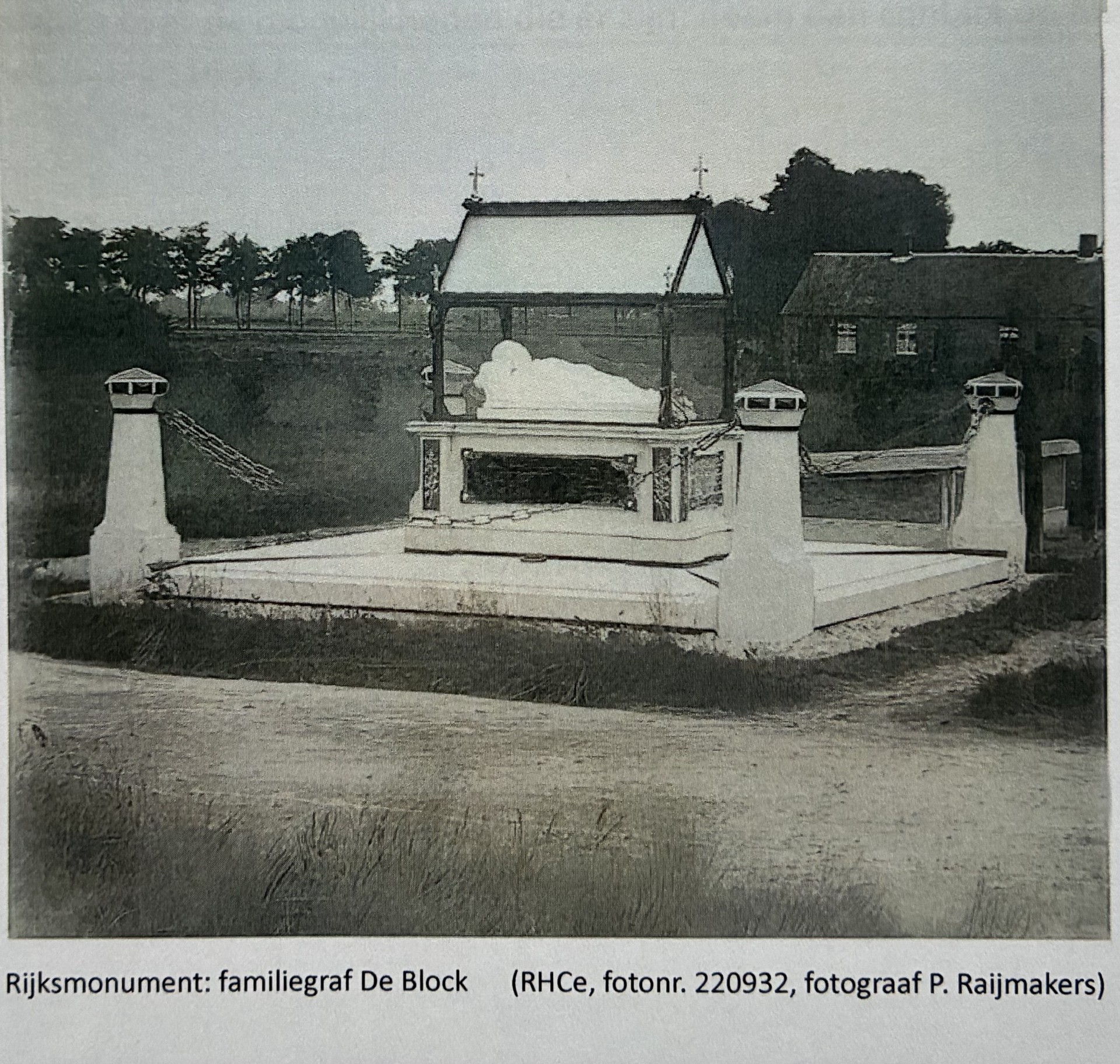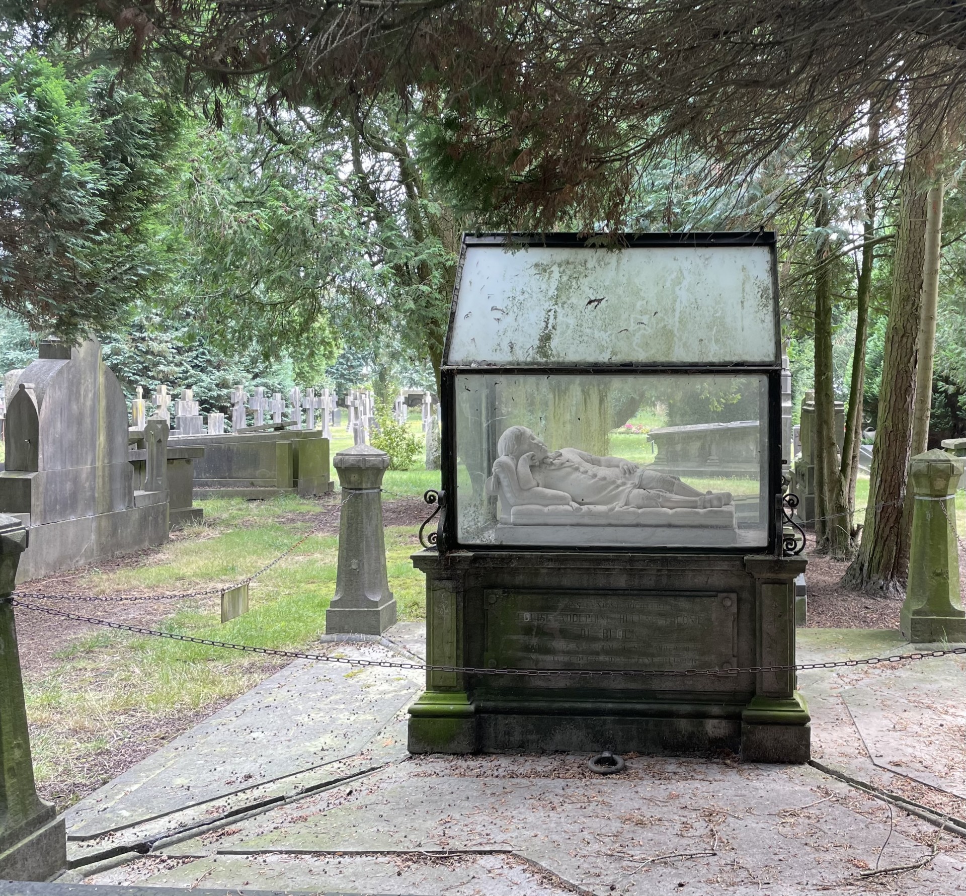 Dit Rijks monumentale graf is in 1887 overgeplaatst van de oude naar de nieuwe begraafplaats, zie foto 5. De oude begraafplaats is geruimd ten behoeve van de bouw van een grotere Sint Joris kerk. De glazen overkapping is na de verhuizing op de natuurstenen sokkel gezet om zo het witte natuurstenen beeld te beschermen tegen verdere versuikering. Het glas is gevat in ijzeren profielen en ter versiering zijn op de hoeken smeedijzeren krullen aangebracht. Foto 1.